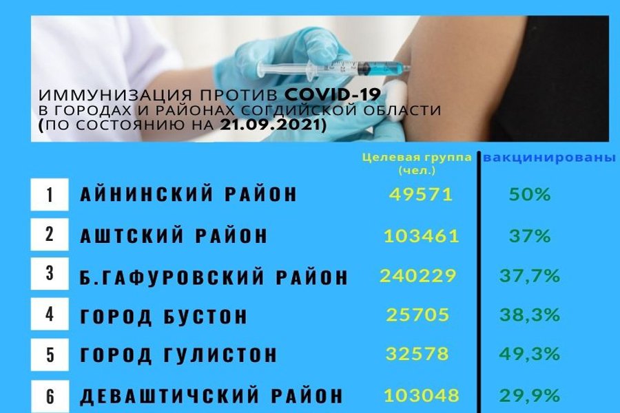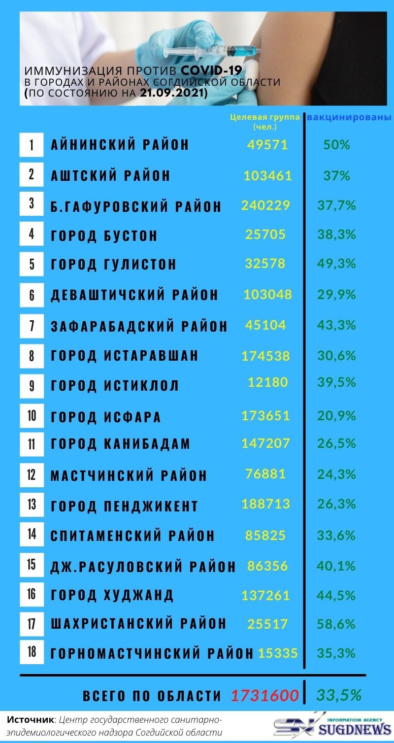 Иммунизация против коронавирусной инфекции COVID-19 в городах и районах Согдийской области (по состоянию на 21.09.2021).