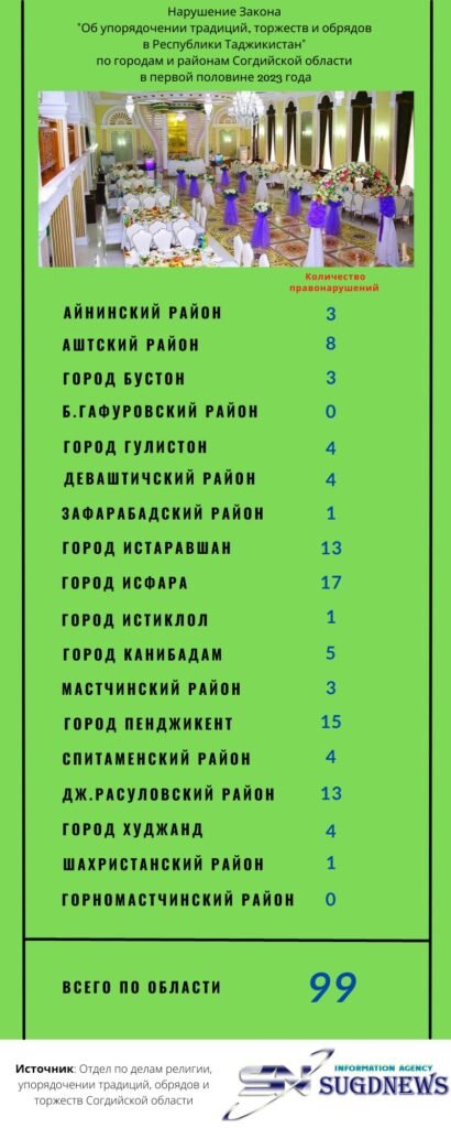 По его словам, за шесть месяцев текущего года в городах и районах Согдийской области в ходе проведения совместных рейдов членами постоянной комиссии, а также при надзорной проверке свадеб и обрядов ответственными лицами областного отдела по делам религии, упорядочении традиций, обрядов и торжеств и его отделений в городах и районах было зафиксировано 99 случаев нарушения законодательства, что по сравнению с аналогичным периодом прошлого года меньше на 14 фактов. При этом, больше всего нарушений зафиксировано в городе Исфара - 17 фактов.