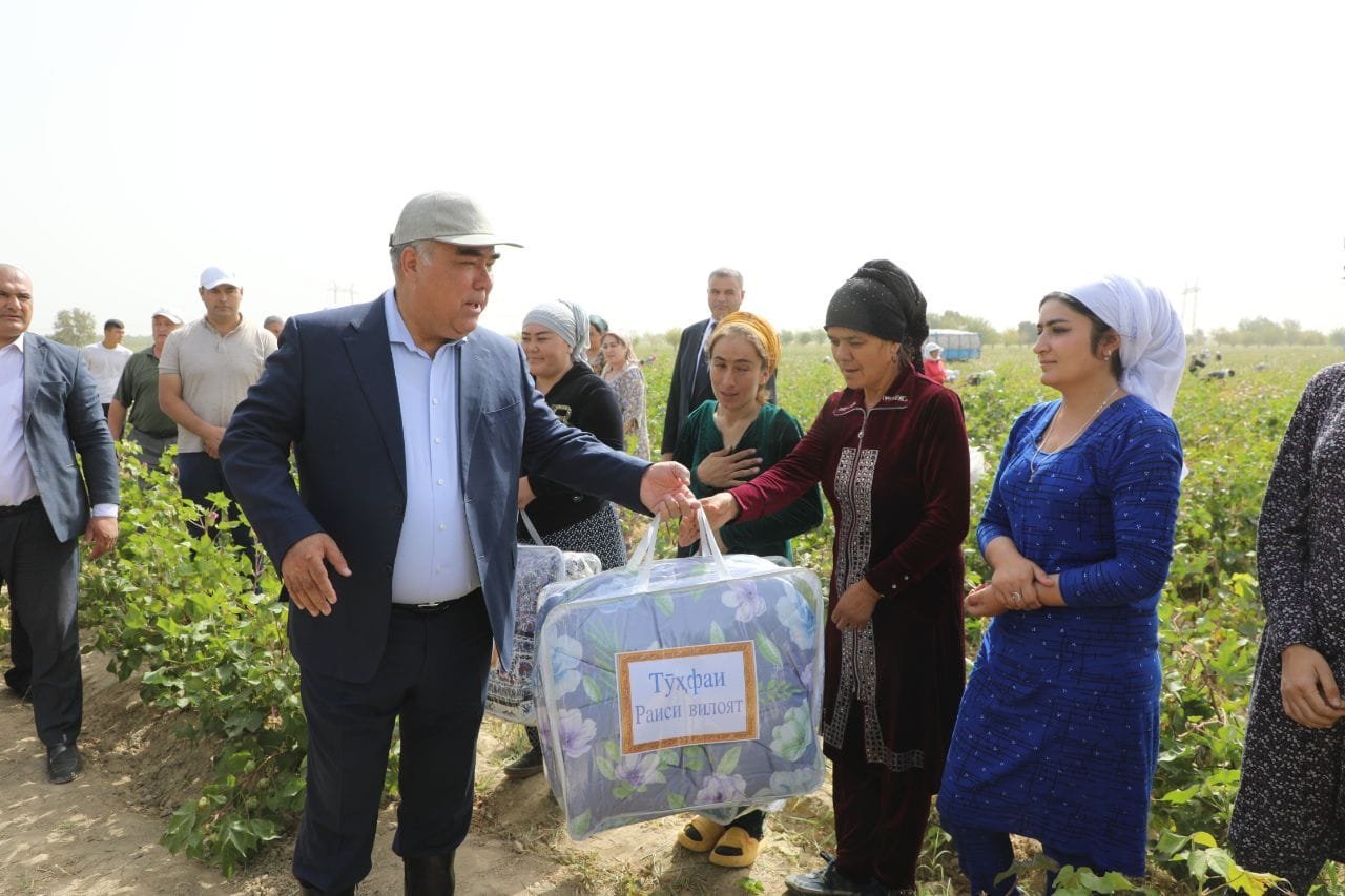 В настоящее время в этих хозяйствах Зафарабада продолжается сбор хлопка-сырца. 12 сентября к сборщикам хлопка присоединился и председатель области Раджаббой Ахмадзода. Он приехал в район для ознакомления с ходом хлопкоуборочной кампании. Об этом сообщили в пресс-службе областной администрации.